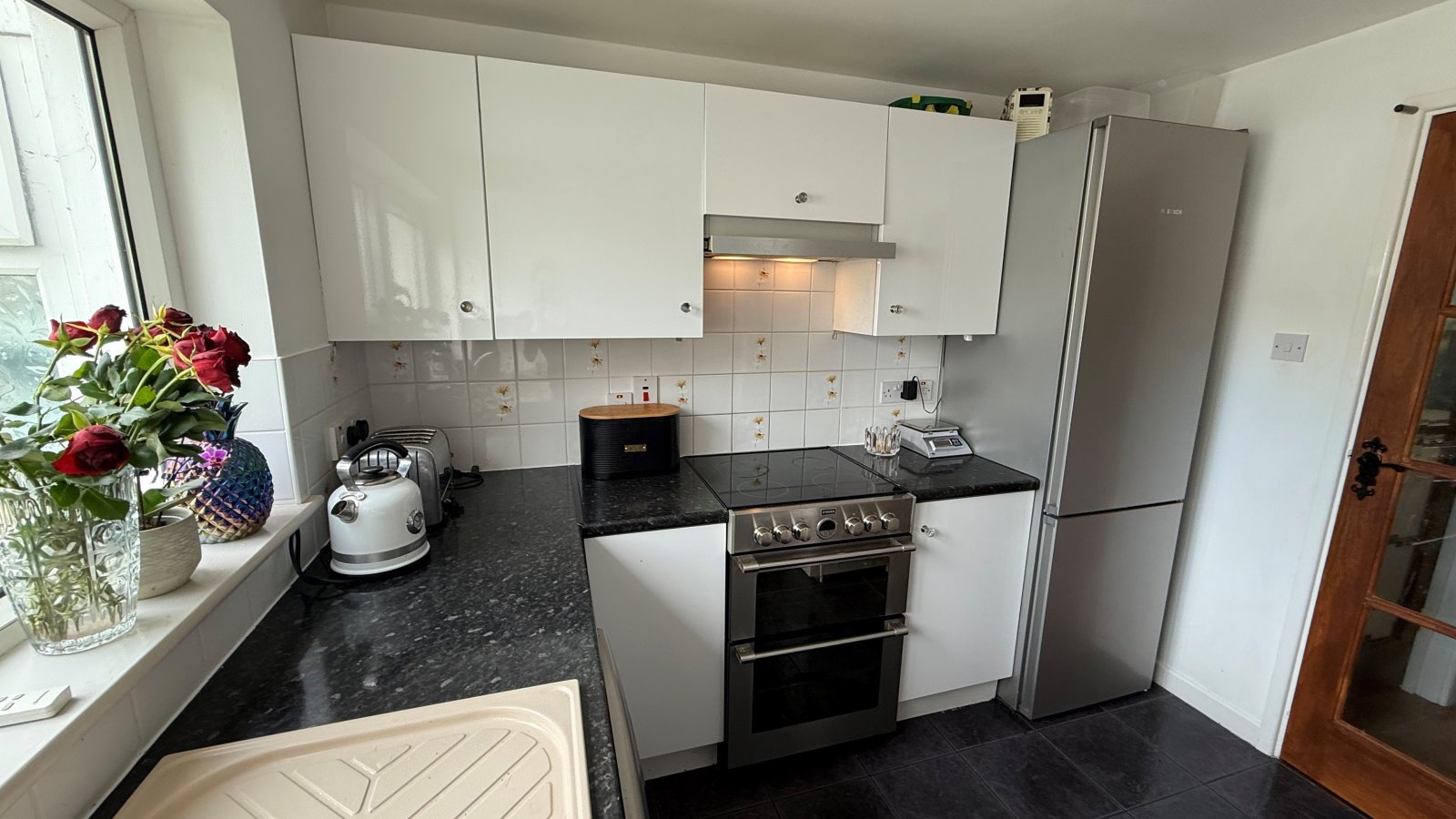 Appliances include four ring electric Stoves hob and double oven, Bosch dish washer, Bosch fridge and freezer.